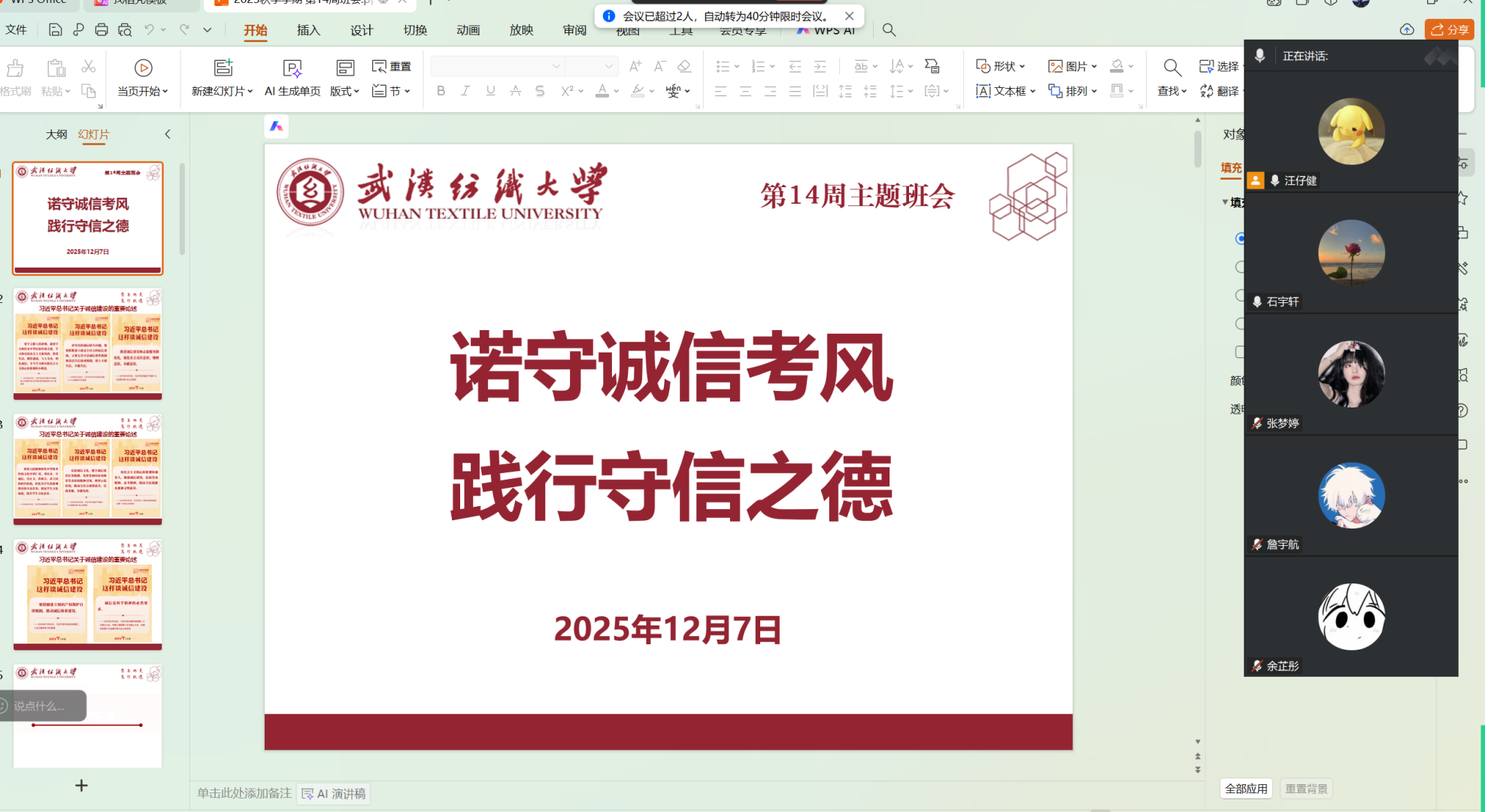 为进一步强化学生思想引领,厚植家国情怀,夯实成长根基,12月7日我院各年级近期结合学情与主题班会文件核心要求,分别组织开展“诺守诚信考风,践行守信之德”的主题班会活动,引导不同学段学子找准成长航向。