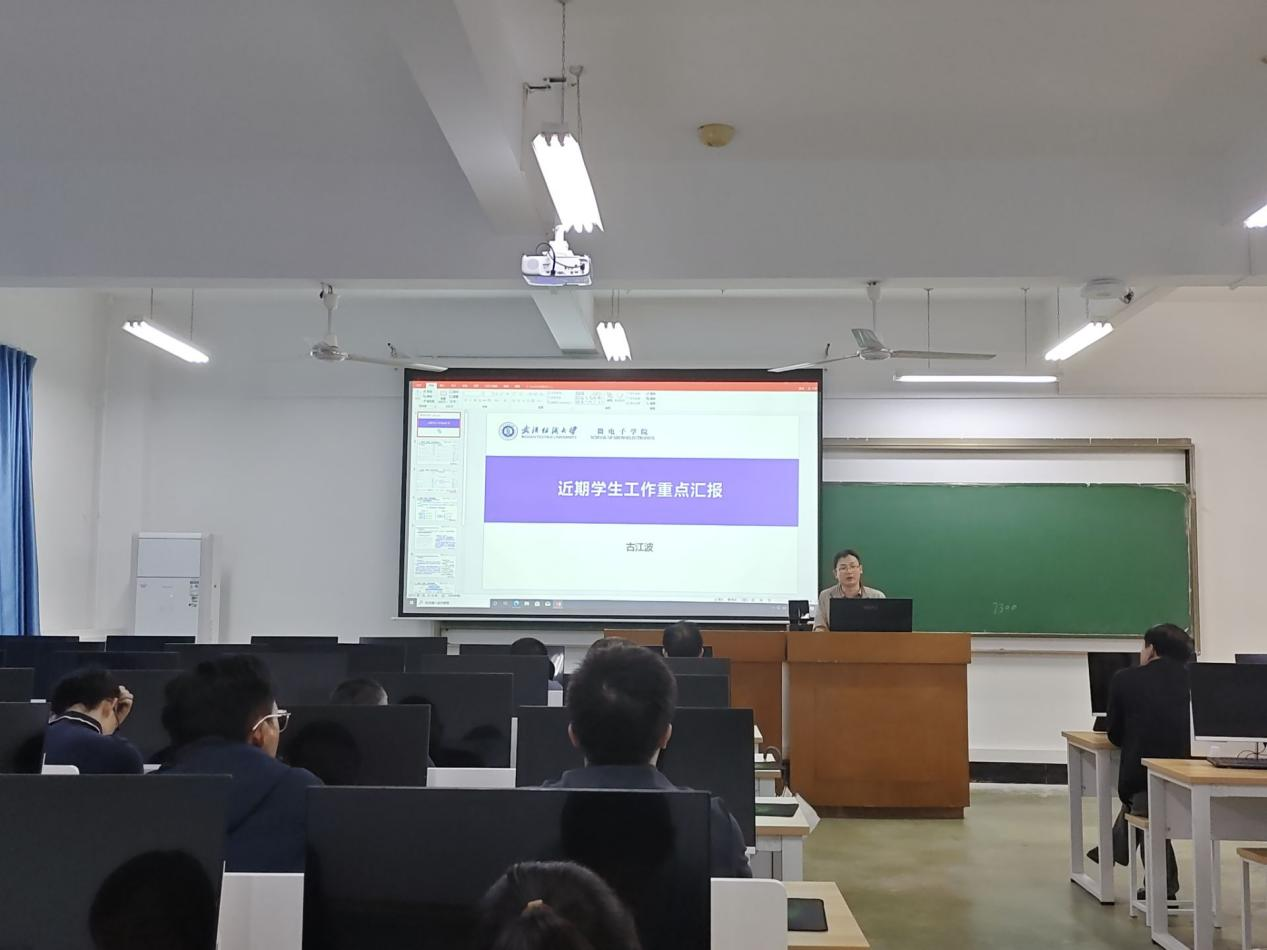 学院党总支副书记古江波就近期学生工作进行专题汇报,介绍了学院实施兼职班主任试点工作计划,号召全体导师、班主任支持学生工作,共同守牢安全底线,推进学风建设,推进人才培养改革,通过科教融合、社团思政、实践育人等引导学生走出寝室、走出手机、走出游戏,走向操场、走向实验室、走向社会,促进学生全面成长成才。