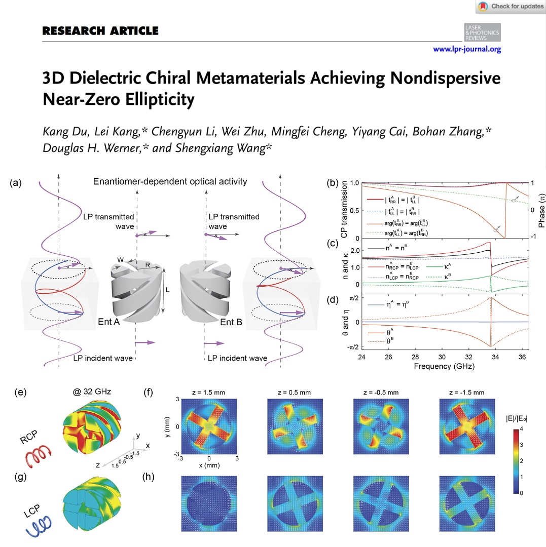近日,永利3044集团汪胜祥教授团队在国际著名光学期刊“Laser & Photonics Reviews”上发表了题为“3D Dielectric Chiral Metamaterials Achieving Nondispersive Near-Zero Ellipticity”的高水平研究性论。该研究工作展示了一种基于光固化3D打印工艺制备的复杂手性螺旋三维(3D)超材料。该超材料在毫米波频段实现了宽频带、非色散的近零椭圆率,对左旋圆偏振(LCP)和右旋圆偏振(RCP)入射电磁波表现出近乎相同的共极化透射强度及显著的相位延迟差异。利用先进三维制造技术实现具有复杂参数空间的三维超原子,有望成为设计与制备多功能精密超材料的新范式。该论文的第一作者为汪胜祥教授团队的杜康副教授,3044澳门永利集团张博涵博士与汪胜祥教授为本论文的共同通讯作者,3044澳门永利集团为第一单位。