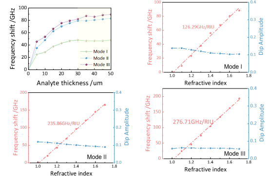 程思洋:本次组会汇报了我在太赫兹指纹谱检测超表面研究方面的最新进展。我设计出一种能够在太赫兹波段激发Toroidal亚辐射模式的超表面结构,该模式通过环形偶极子与电偶极子的干涉相消效应,将能量高度局域在结构近场,形成强烈的电磁热点,从而显著增强了光与物质的相互作用。所设计的结构可同时激发两个共振峰:一个由Toroidal模式主导,展现出典型的亚辐射特性;另一个则由普通电偶极子共振主导。在性能评估中,我们模拟了该结构对不同折射率样品的响应,结果显示当待测物折射率从1增至1.8时,灵敏度最高达到276.71 GHz/RIU。此外,我们进一步以α-乳糖为模型分子,模拟验证了该超表面在特异性分子指纹谱检测方面的能力,为发展高灵敏度、无标记太赫兹传感平台提供了重要依据。