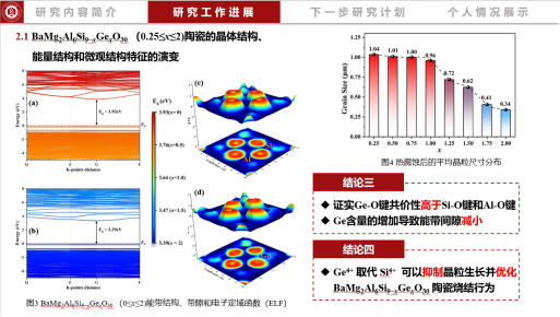 李成云:随着通信技术向毫米波与太赫兹频段发展,对微波介质陶瓷提出了更高要求:需具备超低介电常数(εᵣ ≤ 6)、高Q×f值、近零τf值以及低热膨胀系数(CTE)。然而,现有低介陶瓷往往τf呈较大负值、CTE偏高,且通过添加第二相调控会严重损害微波性能,导致多项参数难以协同优化。针对该难题,本人基于大隅石型BaMg₂Al₆Si₉O₃₀陶瓷,提出多面体耦合调控策略,通过以Ge⁴⁺部分取代Si⁴⁺,精准调控晶体结构。该方案有效抑制晶格振动,降低热膨胀,并增强键价共价性,从而在单相陶瓷中实现性能协同突破。最终BaMg₂Al₆Si₇.₇₅Ge₁.₂₅O₃₀组分中获得卓越综合性能:εᵣ = 5.84,Q×f = 32,351 GHz,τf = ‒7.27 ppm/°C,CTE低至+1.07 ppm/°C,为解决高频通信器件中材料性能难以协同优化的瓶颈问题提供了新的思路和一种极具应用潜力的候选材料。