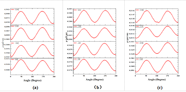 谢仕顶:本次组会汇报了近期工作。针对不同温度下PI衬底上的薄膜(10nmFeNi)的AMR变化。在一定厚度的PI衬底上,在真空度为10-8 Torr下沉积了10nm的FeNi合金薄膜,并沉积了一层氮化硅来做保护膜,样品的示意图10,并在上面沉积Au作为电极,用四端法来测量磁电阻。测量了四种不同凹凸模具上的样品,通过模具给样品施加拉伸和压缩应力。同时进行了变温测量,在80K-320k温度下,测量磁电阻随角度和磁场大小的变化。施加应力情况下(凹和凸),它们都呈现了磁各项异性。不同的是,通过数据看出。随着温度的升高,电阻率增大;外加应力也会导致电阻率的增加。由此可以看出应力导致的应变能改变磁性能,这是符合研究现状的。