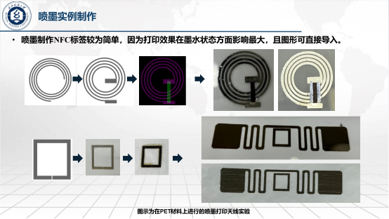 郑明琦:本次组会主要汇报了由喷墨和点胶工艺来制作RFID天线的可行性以及制作效果。其中,喷墨工艺采用微电子打印机厂家提供的银质导电墨水,导电率在106S/m。在CST软件中仿真得到预设的天线图案之后,导入打印机软件中,通过喷墨的工艺得到图案,测试导电率达到要求;在此基础上,通过点胶工艺,将预设的方形图案打印在相纸、PI上,再通过过桥的方式,即在外部线圈上面铺设介电层之后再连接外部线圈的两端,使之成为一个闭合的线圈,则得到一整个天线,之后再尝试在天线预设的端口上绑定芯片,测试是否达到NFC标签效果。