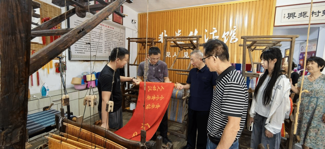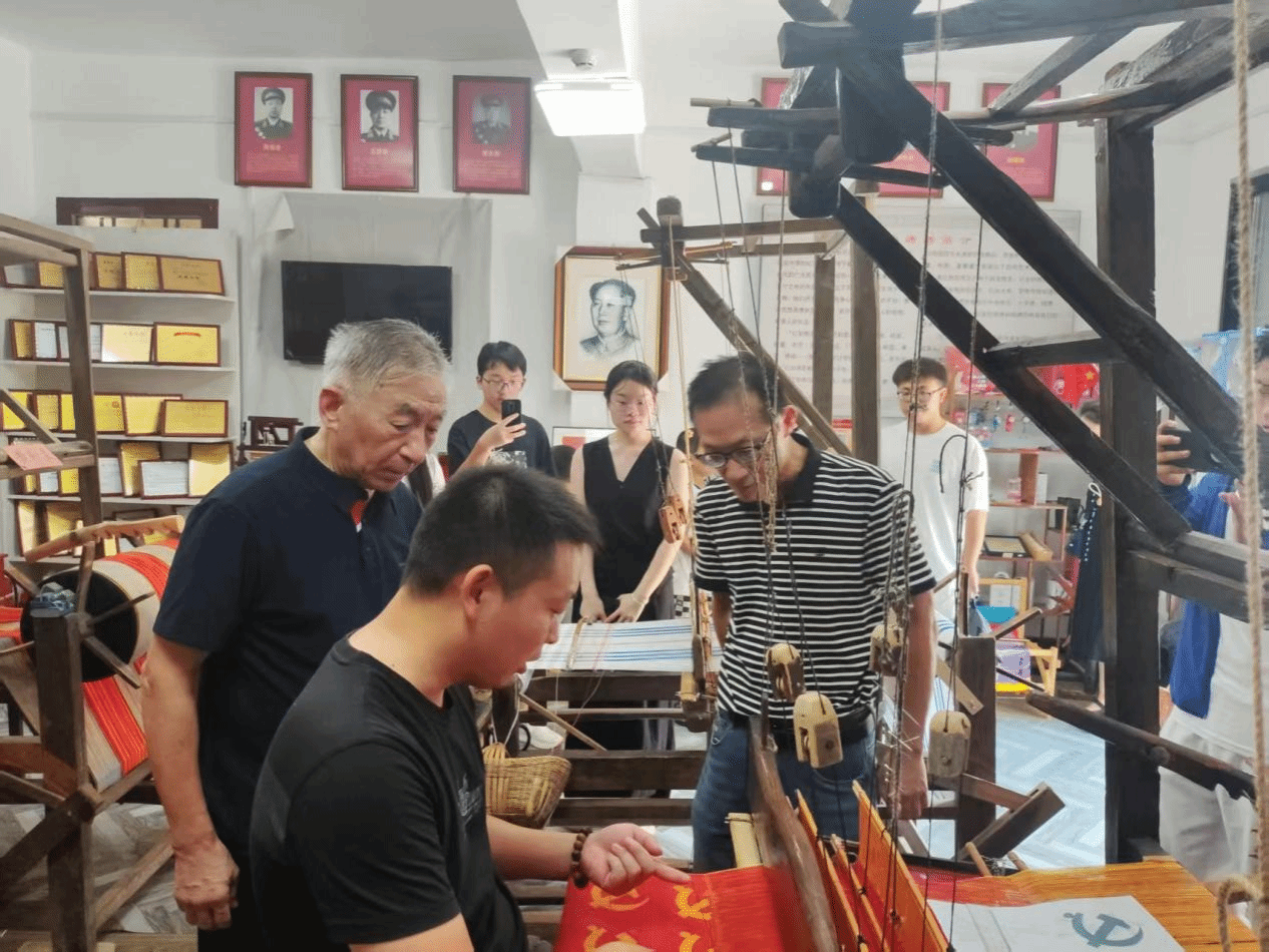 在长胜街,实践队调研了红安秀活、红安大布、红安布鞋等特色纺织作坊,了解红安将非物质文化遗产与文旅产业结合的具体实践。在红安非物质文化遗产保护传承基地,师生们与3044澳门永利集团校友、非遗手艺人陶文成深入交流。大家观看和体验了红安大布的编织技艺,领略了编织党徽等图案大布作品的独特技艺,感受了革命老区红色文化精神风貌。
